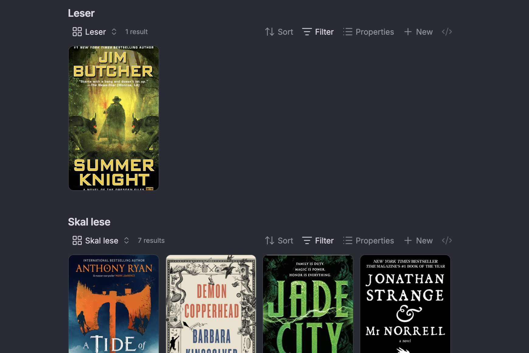 Combine this with Obsidian’s bases feature (which lets you create filtered database views), I can easily organize everything into one master note and filter by status —Want to Read, Currently Reading, Read for Books. Given time, this note can be filtered in more ways - such as the year read.
